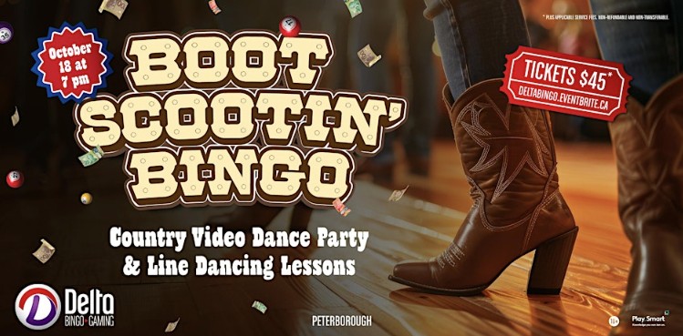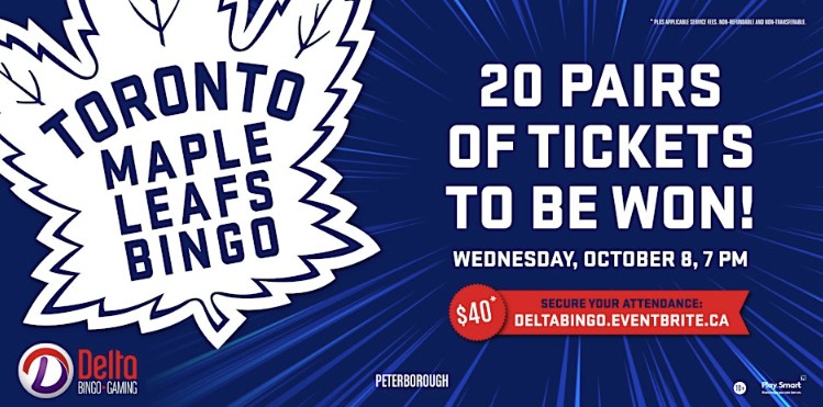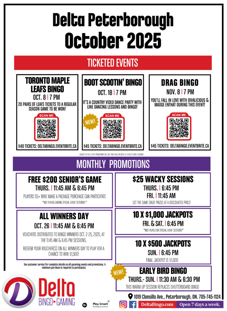 Check out upcoming Delta Bingo Peterborough’s offerings, featuring Toronto Maple Leafs Bingo Oct 8, and Boot Scootin’ Bingo Oct 18.